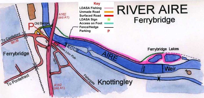 River Aire. Left bank commences approximately 100 yards below A1 road bridge for approximately 500 yards downstream.